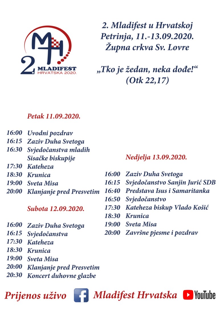 Petrinja, (IKA) – Mladifest u Hrvatskoj održat će se od 11. do 13. rujna u župnoj crkvi Sv. Lovre u Petrinji pod geslom „Tko je žedan, neka dođe!“