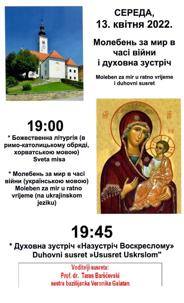U 19 sati je redovna misa na hrvatskom jeziku te nagovor i „molben za mir u ratno vrijeme“ na ukrajinskom jeziku. Nakon toga bit će duhovi susret „Ususret Uskrslom“ u vjeronaučnoj dvorani koji predvodi dr. sc. Taras Barščevski i sestra bazilijanka Veronika Galatan.