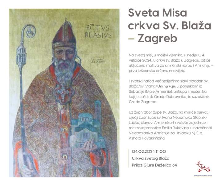 Zagreb, (IKA) – Na misi u nedjelju 4. veljače u 11 sati u crkvi sv. Blaža u Zagrebu u molitvu vjernika bit će uključena molitva za armenski narod i Armeniju – prvu kršćansku državu na svijetu.