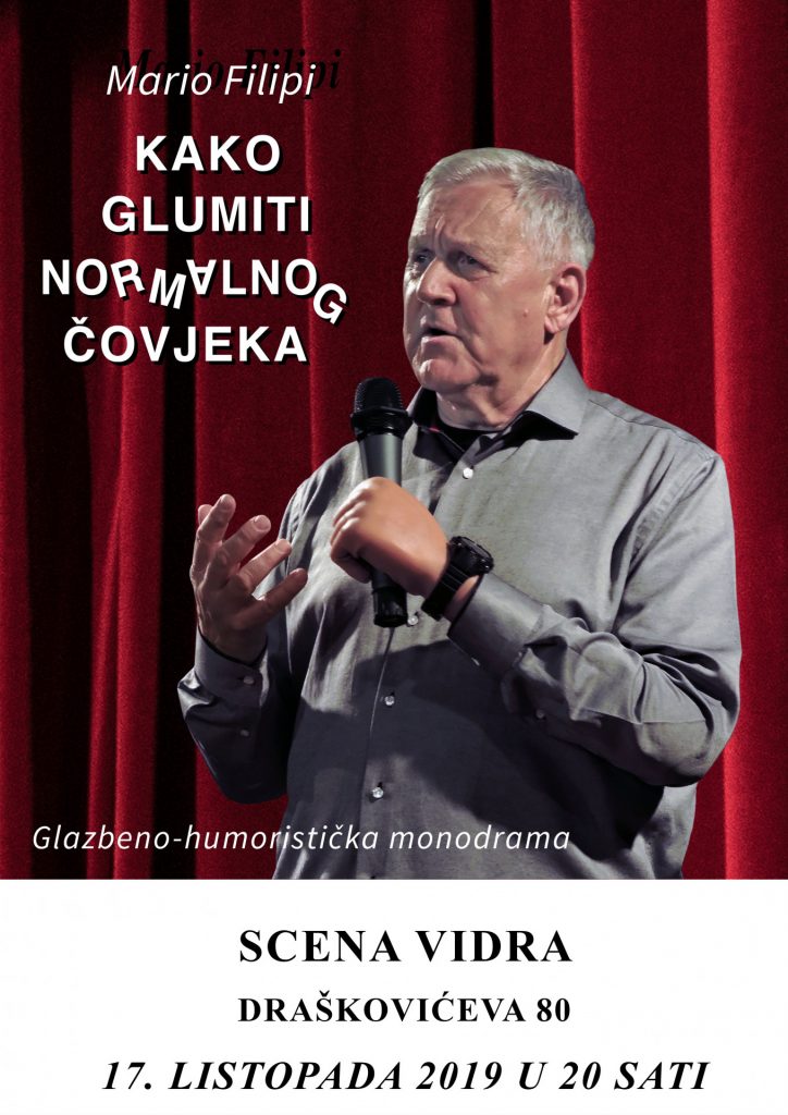 U četvrtak 17. listopada u 20 sati u sceni „Vidra“ u Zagrebu gostuje Mario Filipi s glazbeno-humorističkom autobiografskom monodramom „Kako glumiti normalnog čovjeka“. To je 24. izvedba te kazališne predstave, a sedma u Zagrebu.