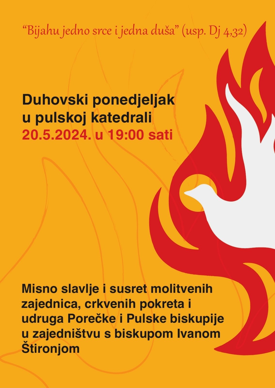 Mons. Štironja će povodom susreta molitvenih zajednica, crkvenih pokreta i katoličkih udruga slaviti misu na Duhovski ponedjeljak – spomendan Marije Majke Crkve, 20. svibnja u 19 sati u pulskoj katedrali Uznesenja Blažene Djevice Marije.