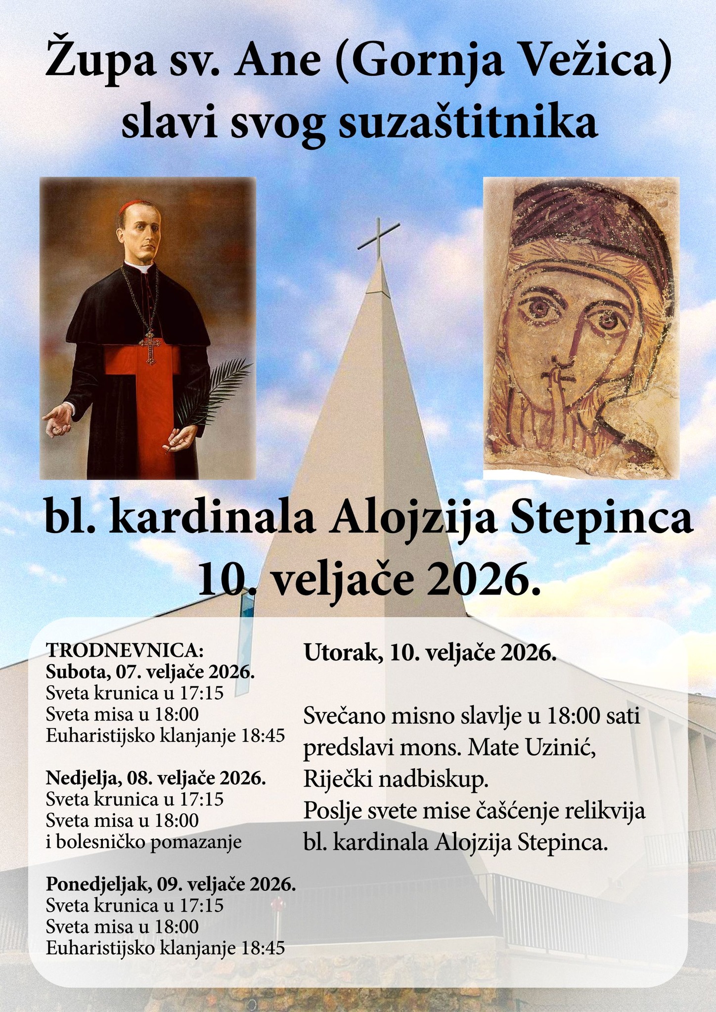 Riječka Župa sv. Ane na Gornjoj Vežici u utorak 10. veljače slavi svog suzaštitnika, bl. kardinala Alojzija Stepinca. Svečano misno slavlje u 18 sati predvodit će riječki nadbiskup Mate Uzinić, a nakon mise vjernici će imati priliku za čašćenje relikvija blaženika, kardinala Stepinca.