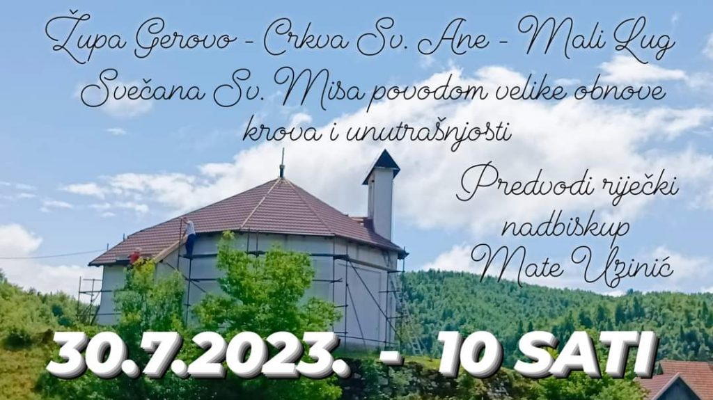 Mali Lug, (IKA) – Riječki nadbiskup Mate Uzinić slavit će misu u nedjelju 30. srpnja u 10 sati u crkvi sv. Ane u Malom Lugu u župi Gerovo u povodu završetka obnove krova i unutrašnjosti.