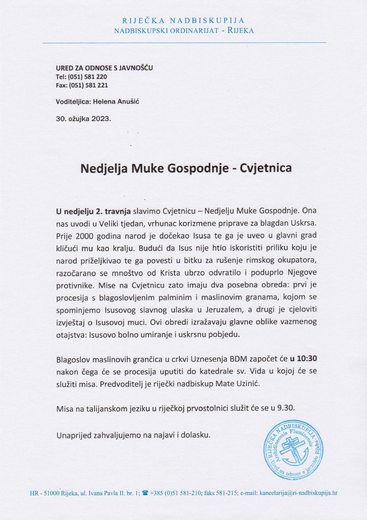 Nadbiskup Mate Uzinić predvodit će misu na Cvjetnicu u nedjelju 2. travnja u riječkoj katedrali. Blagoslov maslinovih grančica u crkvi Uznesenja BDM započet će u 10.30 nakon čega će se procesija uputiti do katedrale Sv. Vida u kojoj će se služiti misa koju predvodi nadbiskup Uzinić.