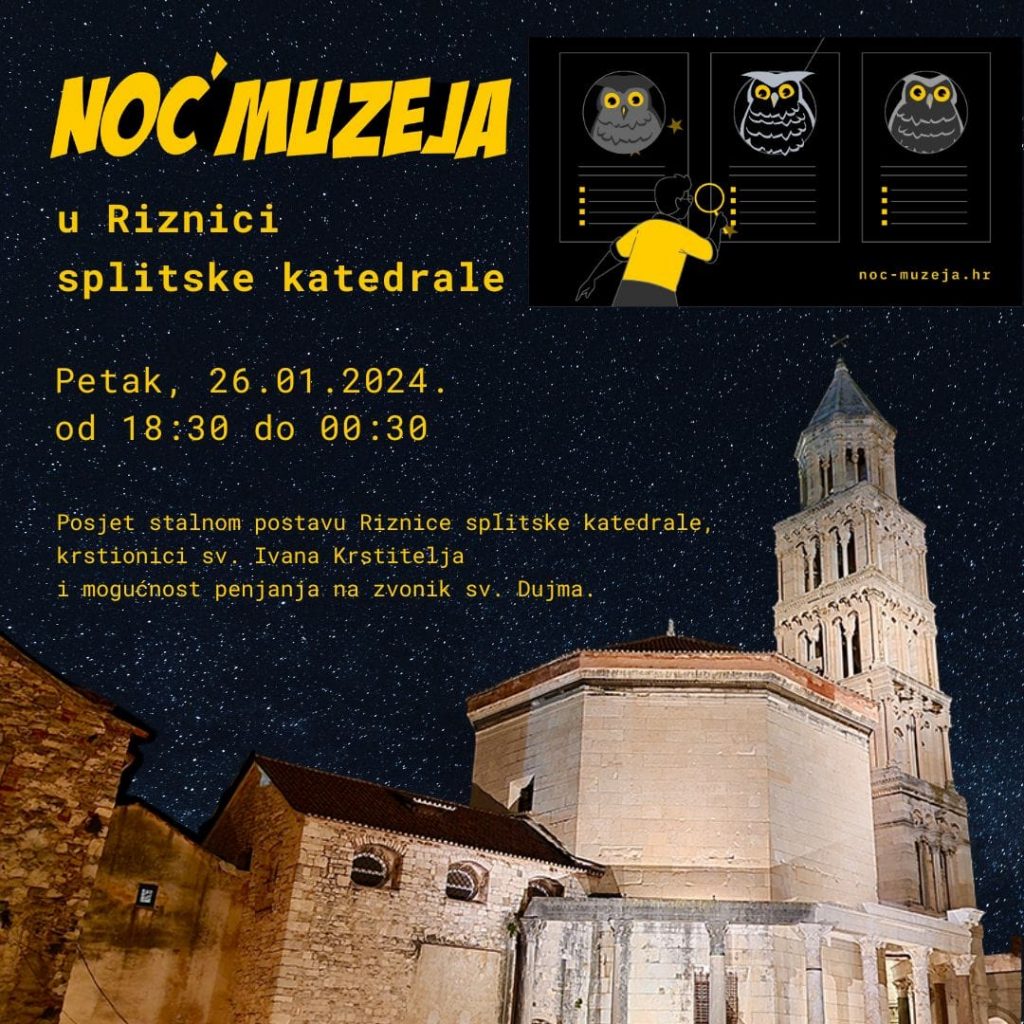 Riznica splitske katedrale sudjelovat će u manifestaciji „Noć muzeja“ koja će se održati u petak, 26. siječnja 2024. godine. Tema 19. Noći muzeja je „Muzeji i nova publika“.