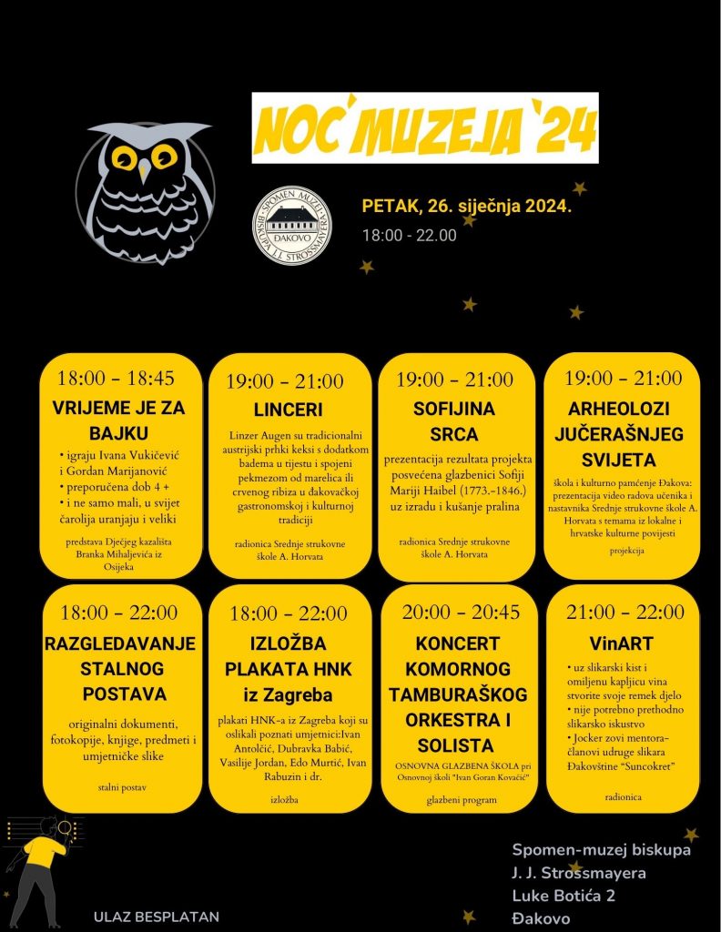 Spomen-muzej biskupa Josipa Jurja Strossmayera u Đakovu sudjelovat će u manifestaciji „Noć muzeja“ koja će se održati u petak, 26. siječnja 2024. godine. Tema 19. Noći muzeja je „Muzeji i nova publika“.