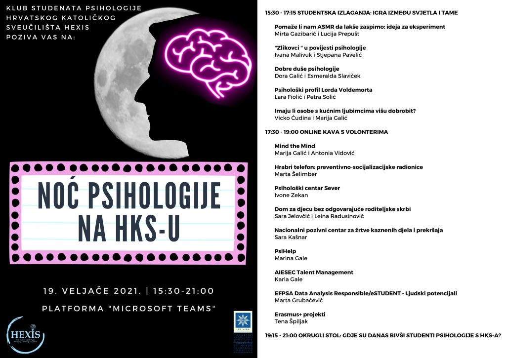 Zagreb, (IKA) – Klub studenata psihologije Hrvatskoga katoličkog sveučilišta Hexis organizira Noć psihologije na HKS-u u petak 19. veljače od 15.30 do 21 sat.
