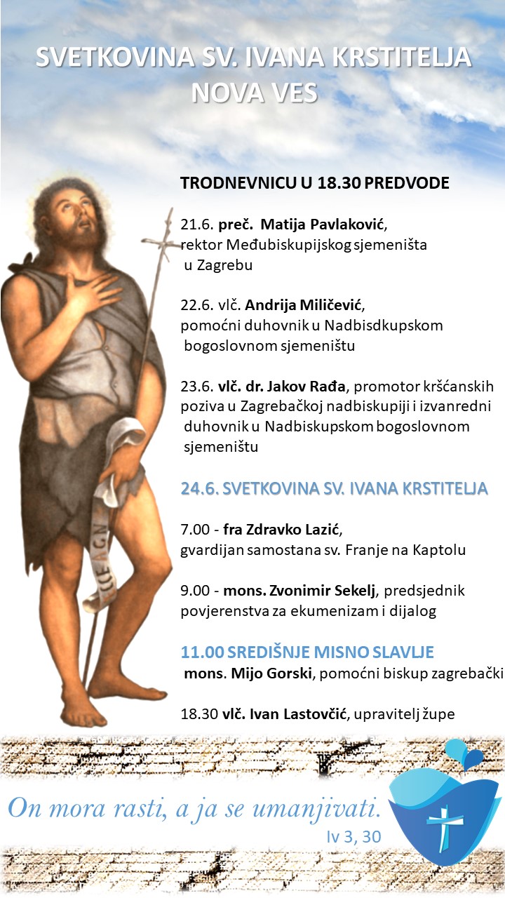 Na samu svetkovinu sv. Ivana Krstitelja misu u 7 sati predvodit će gvardijan samostana sv. Franje na Kaptolu fra Zdravko Lazić, zatim misu u 9 sati predsjednik povjerenstva za ekumenizam i dijalog mons. Zvonimir Sekelj.