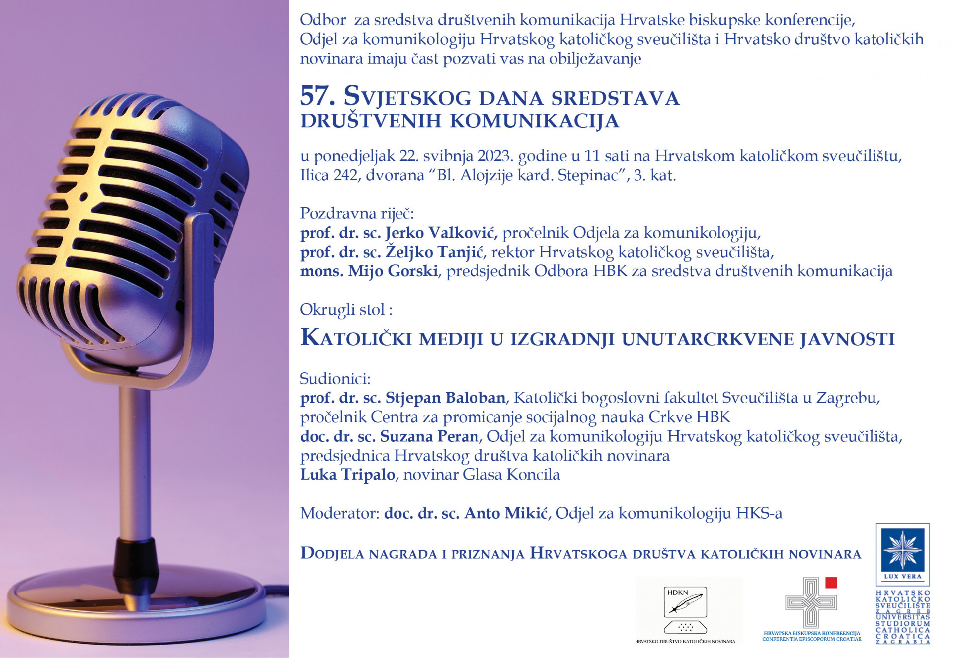 Odbor za sredstva društvenih komunikacija Hrvatske biskupske konferencije, Odjel za komunikologiju Hrvatskog katoličkog sveučilišta i Hrvatsko društvo katoličkih novinara obilježit će u ponedjeljak 22. svibnja 2023. godine u 11 sati na Hrvatskom katoličkom sveučilištu „57. Svjetski dan sredstava društvenih komunikacija“.