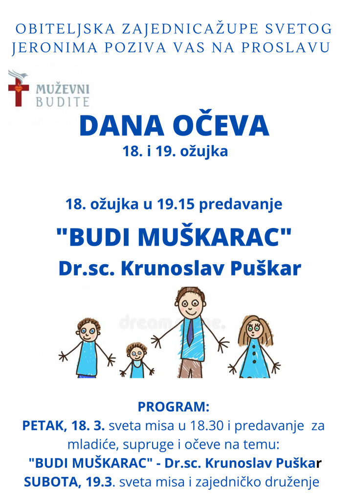 U povodu obilježavanja Dana očeva u zagrebačkoj župi Svetog Jeronima 18. ožujka u 18:30 bit će slavljena misa, a nakon nje bit će održano predavanje za mladiće, supruge i očeve o temi “Budi muškarac” koje će voditi dr. sc. Krunoslav Puškar.
