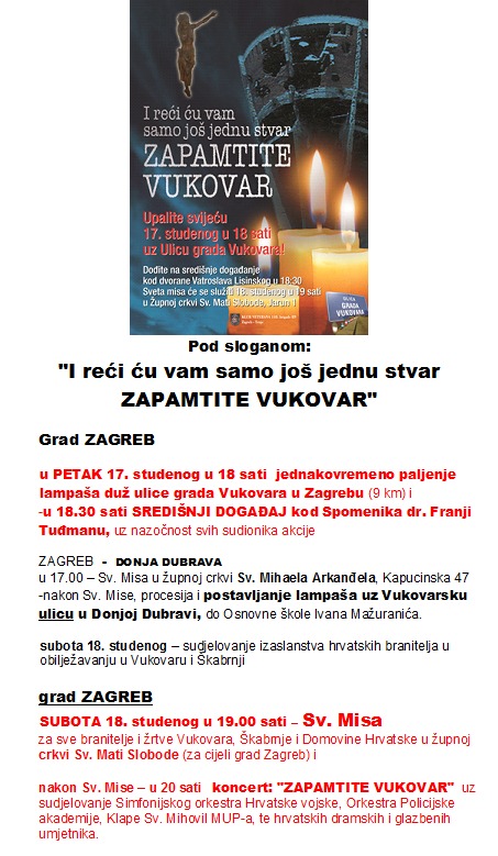 Zagreb, (IKA) – Pod sloganom „I reći ću vam samo još jednu stvar ZAPAMTITE VUKOVAR“ u petak 17. studenog u 18 sati zapalit će se lampaši duž ulice grada Vukovara u Zagrebu. Središnji događaj bit će u 18.30 sati kod Spomenika dr. Franji Tuđmanu.