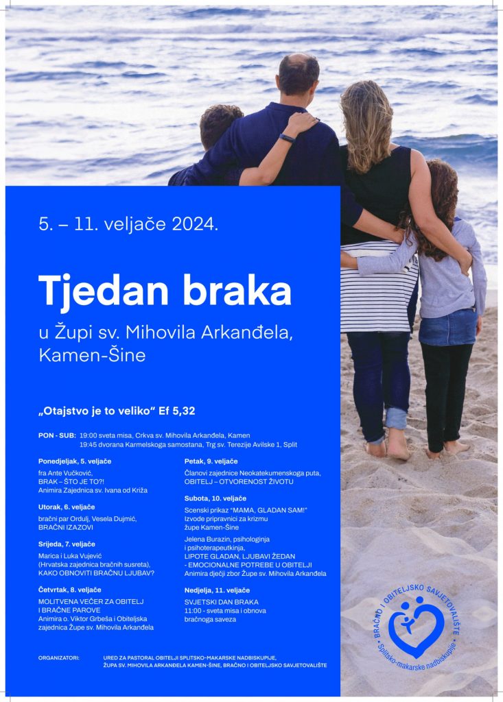 Tjedan braka organiziraju Ured za pastoral obitelji Splitsko-makarske nadbiskupije, Župa sv. Mihovila Arkanđela Kamen-Šine te Bračno i obiteljsko savjetovalište.