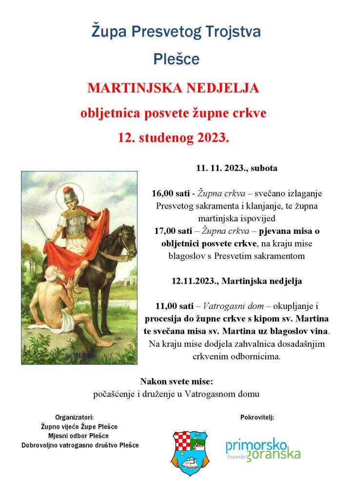 Obljetnica posvete župne crkve u Plešcu proslavit će se misnim slavljem u nedjelju, 12. studenog 2023. u Župi Presvetoga Trojstva u Plešcu u 11 sati. Obljetnici će prethoditi  jednodnevna priprava, koja će početi euharistijskim klanjanjem u subotu, 11. studenog 2023. u 16 sati