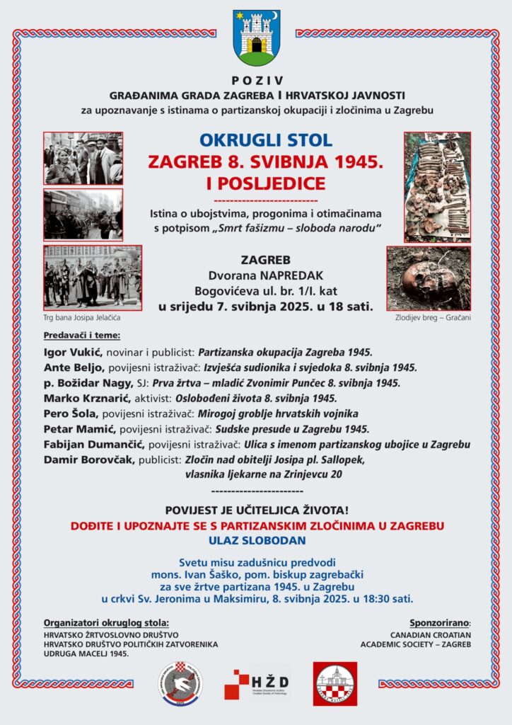 Dan ranije, 7. svibnja, održat će se i okrugli stol pod nazivom „Zagreb 8. svibnja 1945. i posljedice“ u dvorani Napredak (Bogovićeva 1/1) s početkom u 18 sati. Na skupu će govoriti povjesničari, publicisti i istraživači, a teme uključuju svjedočanstva o sudbinama ubijenih, pregled sudskih presuda, imena odgovornih i dokumentiranu evidenciju zločina koji su se dogodili pod okriljem partizanskog režima. Organizatori su Hrvatsko žrtvoslovno društvo, Hrvatsko društvo političkih zatvorenika i Udruga Macelj 1945.