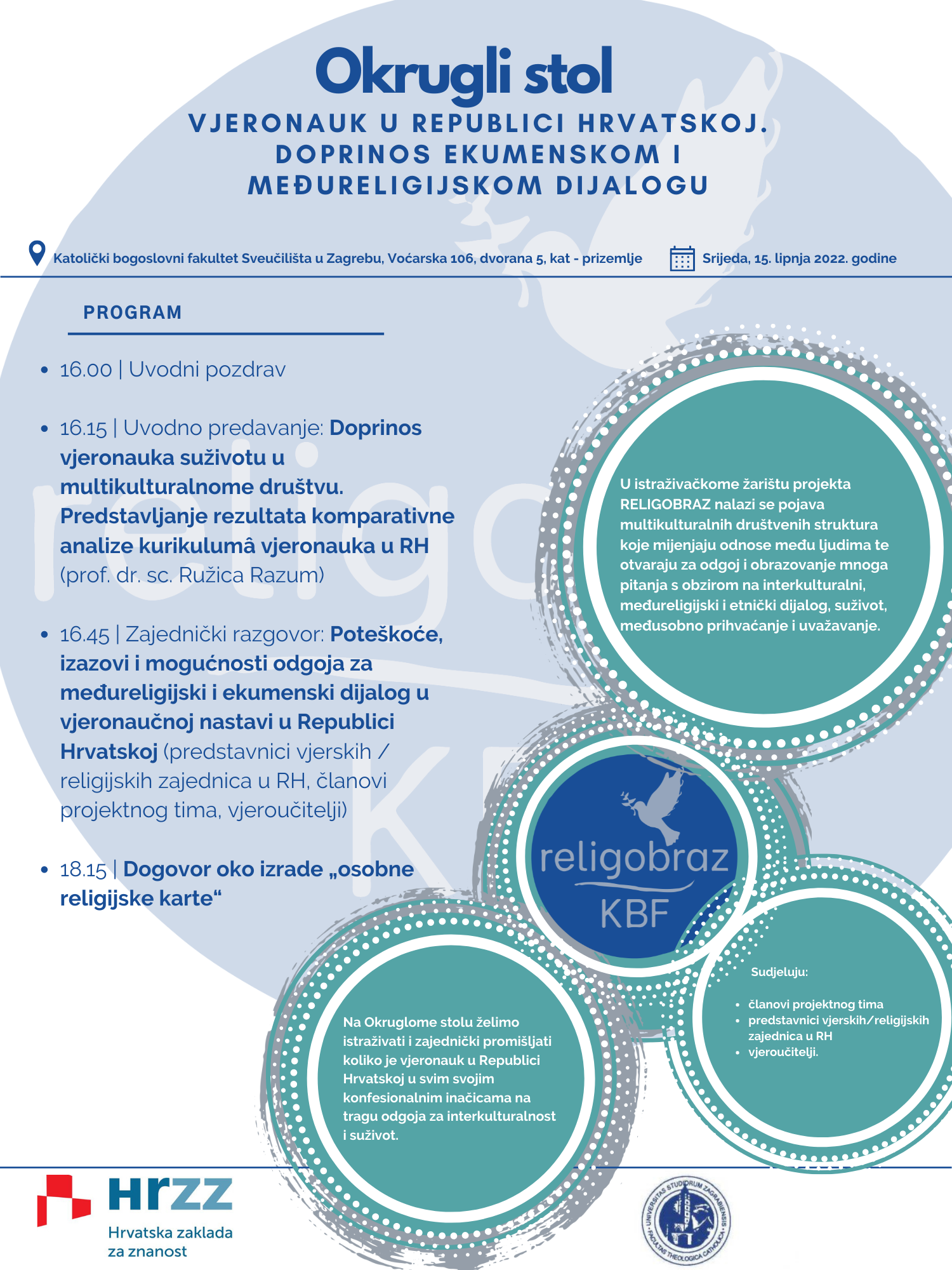 U srijedu, 15. lipnja na Katoličkom bogoslovnom fakultetu u Zagrebu održat će se okrugli stol Vjeronauk u Republici Hrvatskoj. Doprinos ekumenskom i međureligijskom dijalogu. Sudionici su predstavnici vjerskih/religijskih zajednica u RH, vjeroučitelji i članovi projektnog tima RELIGOBRAZ u okviru kojeg se održava okrugli stol.