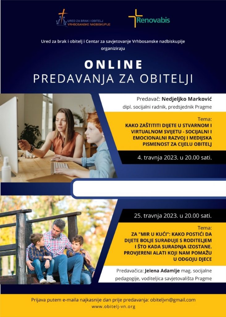 „Online“ predavanje za obitelji o temi „Za ‚mir u kući‘: Kako postići da dijete bolje surađuje s roditeljem i što kada suradnja izostane. Provjereni alati koji nam pomažu u odgoju djece“, održat će se u utorak 25. travnja u organizaciji Ureda za brak i obitelj i Centar za savjetovanje Vrhbosanske nadbiskupije s početkom u 20 sati.