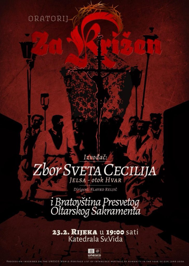 Mješoviti župni zbor „Sveta Cecilija“ iz Jelse na otoku Hvaru i Bratovština Presvetog Oltarskog Sakramenta održat će u petak, 23. veljače 2024. u katedrali sv. Vida u Rijeci koncert na kojemu će izvesti oratorij „Za križen“, skladatelja i dirigenta Slavka Reljića. Početak je u 19 sati, a ulaz se ne naplaćuje. Dirigirat će Zdravko Reljić.