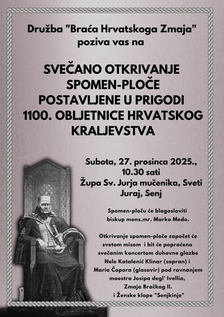 Svečanost otkrivanja spomen-ploče u povodu obilježavanja 1100. obljetnice Hrvatskoga Kraljevstva održat će se u subotu, 27. prosincau u primorskom mjestu Sveti Juraj kraj Senja. Program započinje u 10:30 sati misom u Župi Svetoga Jurja Mučenika, nakon koje slijedi blagoslov spomen-ploče koji će predvoditi gospićko-senjski biskup Marko Medo te njezino svečano otkrivanje.