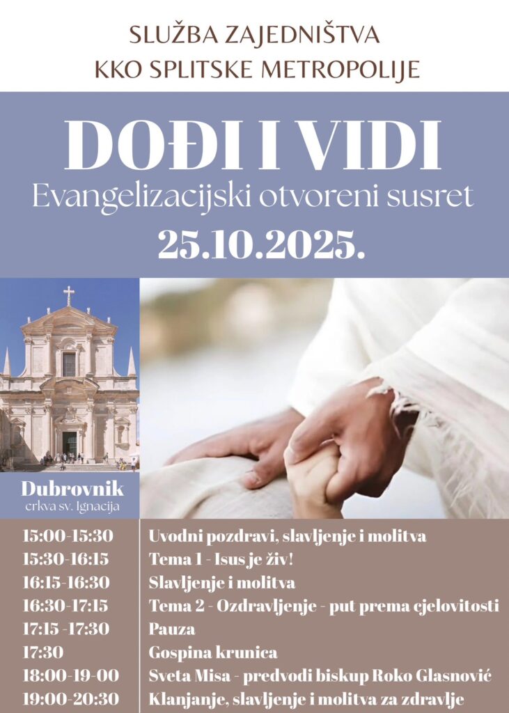 Otvoreni evangelizacijski susret za sve zainteresirane pod nazivom „Dođi i vidi“ održat će se u crkvi sv. Ignacija s početkom u 15 sati. Na susret mogu doći svi zainteresirani. Susret će se sastojati od nagovora o dvjema temama, molitve, slavljenja i klanjanja, a euharistijsko slavlje u 18 sati predslavit će dubrovački biskup Roko Glasnović.