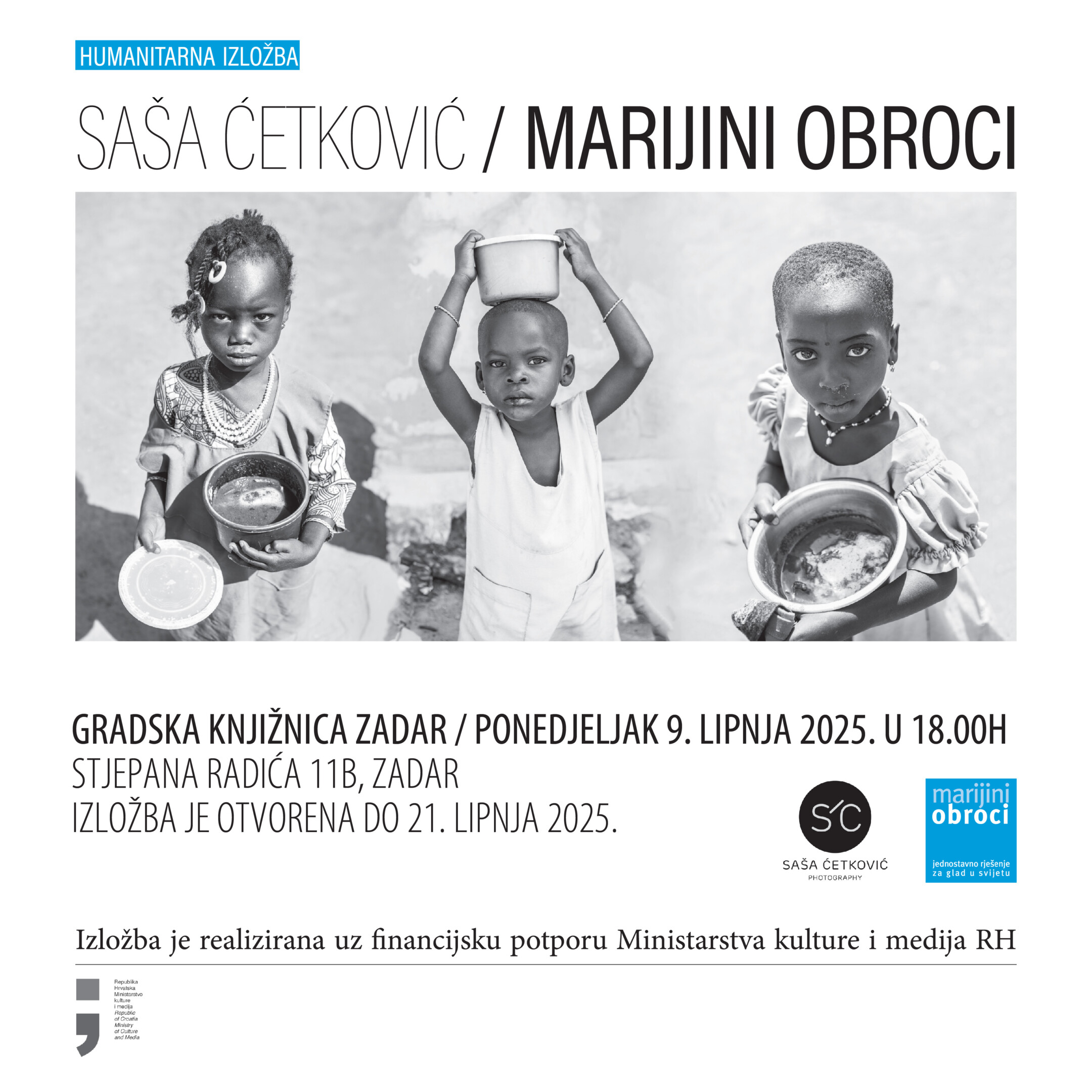 Otvorenje Humanitarne izložbe fotografija „Marijini obroci/Saša Ćetković“ bit će održano 9. lipnja 2025. u Gradskoj knjižnici Zadar (Ul. Stjepana Radića 11b) s početkom u 18 sati.
