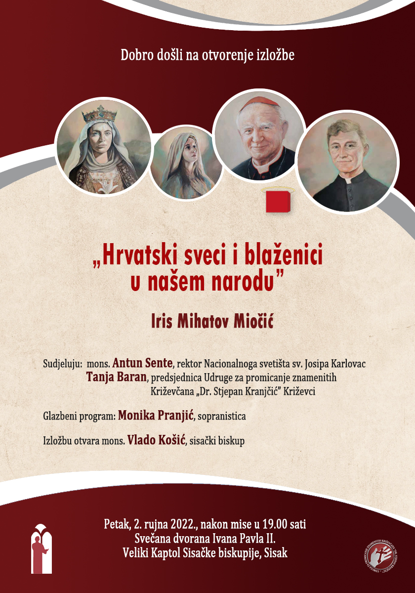 Izložba „Hrvatski sveci i blaženici u našem narodu“ zadarske akademske slikarice Iris Mihatov Miočić bit će otvorena u petak 2. rujna 2022. u svečanoj dvorani Ivana Pavla II. Velikog Kaptola Sisačke biskupije, Trg bana Josipa Jelačića 9. Svečanost započinje nakon mise u 19 sati.