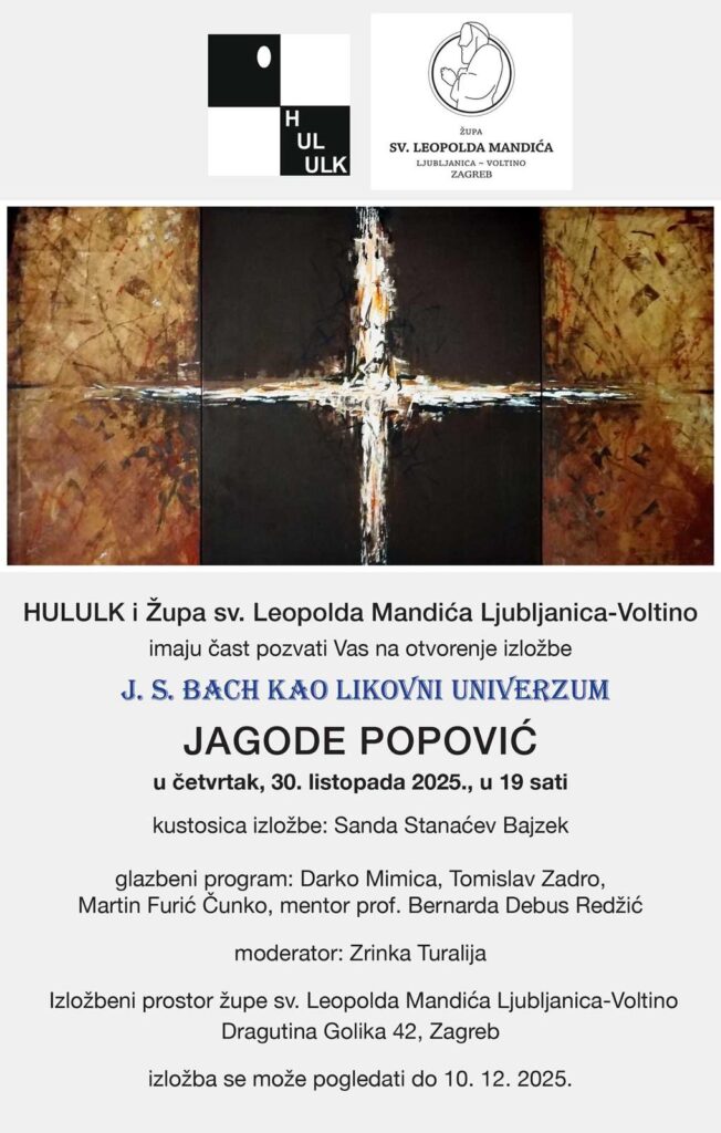 U izložbenom prostoru Župe sv. Leopolda Mandića u zagrebačkom naselju Ljubljanica-Voltino uoči svetkovine Svih svetih, u četvrtak 30. listopada u 19 sati bit će otvorena nova izložba akademske slikarice Jagode Popović, druga u nizu iz recentnog opusa inspiriranog glazbom J. S. Bacha.
