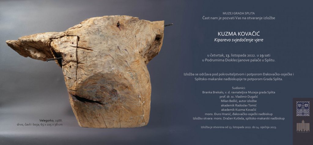 Izložba akademika Kuzme Kovačića Kiparevo svjedočenje vjere bit će otvorena u četvrtak 13. listopada 2022. u Podrumima Dioklecijanove palače u Splitu. Uz akademika Kovačića na otvorenju će sudjelovati đakovačko-osječki nadbiskup Đuro Hranić, mons. Vladimir Dugalić, autor izložbe Milan Bešlić, akademik Radoslav Tomić i v. d. ravnatelja Muzeja grada Splita Branka Brekalo. Izložbu će otvoriti splitsko-makarski nadbiskup Dražen Kutleša.