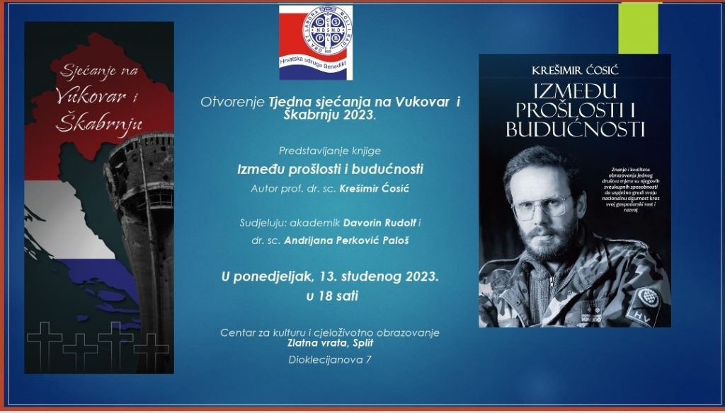 Otvorenje Tjedna sjećanja na Vukovar i Škabrnju 2023. i predstavljanje knjige prof. Krešimira Ćosića „Između prošlosti i budućnosti“ održat će se u ponedjeljak, 13. studenog 2023. u kinoteci „Zlatna vrata“ u Splitu s početkom u 18 sati.
