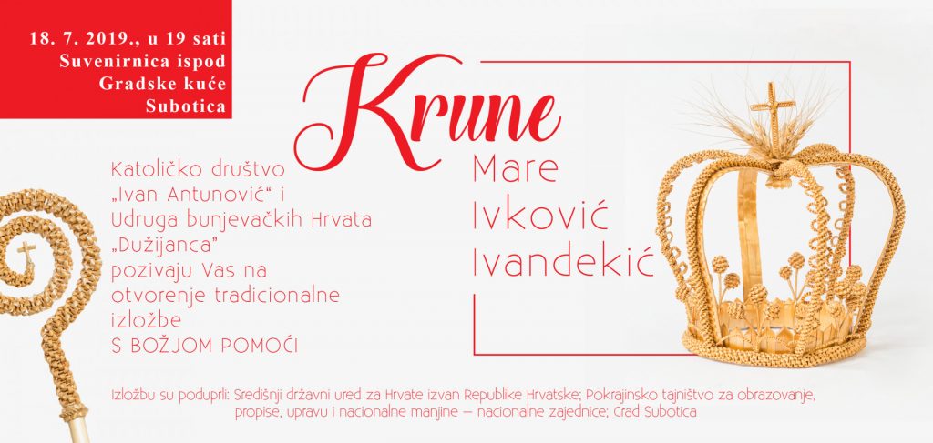 Katoličko društvo „Ivan Antunović“ i Udruga bunjevačkih Hrvata „Dužijanca“ priređuju u četvrtak 18. srpnja s početkom u 19 sati u Suvenirnici ispod Gradske Kuće Subotica otvorenje tradicionalne izložbe „S Božjom pomoći“ – Krune Mare Ivković Ivandekić.