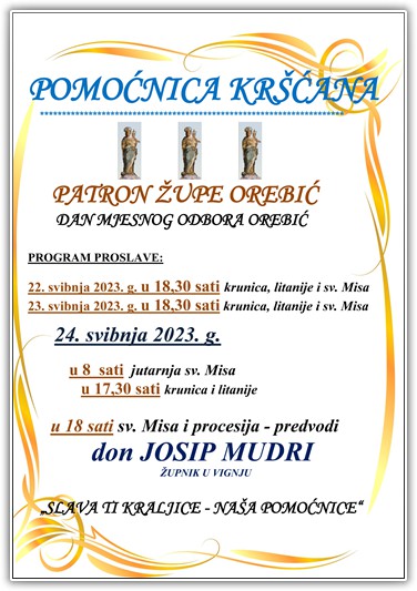 Župa Pomoćnice kršćana u Orebiću u srijedu 24. svibnja proslavlja svoju nebesku zaštitnicu. Središnje euharistijsko slavlje s procesijom s početkom u 18 sati predvodi don Josip Mudri, župnik župe svetog Mihovila u Vignju. Pola sata prije mise molit će se krunica.