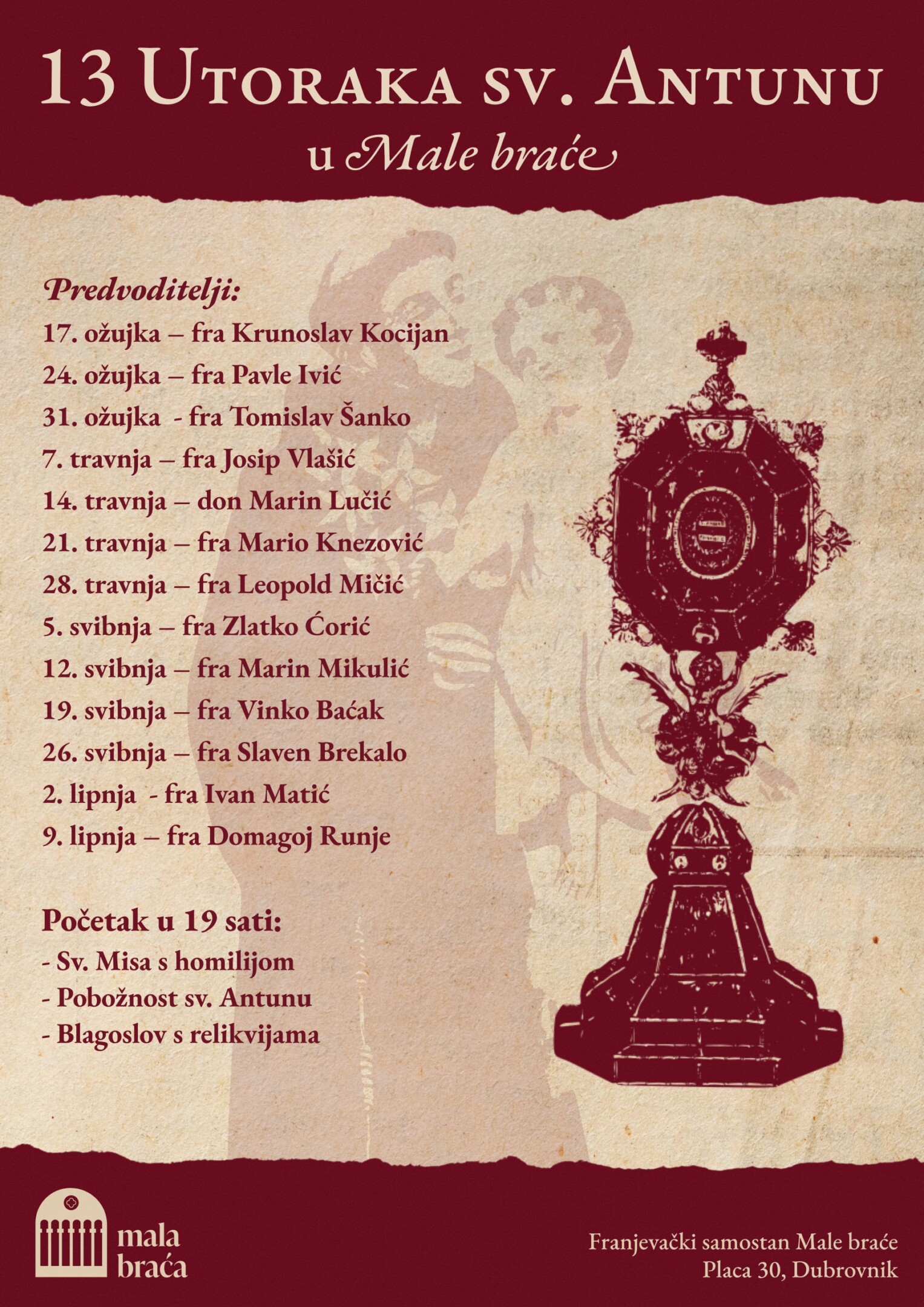 U franjevačkom samostanu Male braće u Dubrovniku održava se pobožnost „13 utoraka sv. Antunu”. Šesti utorak, 21. travnja, misno slavlje u 19 sati predvodi fra Mario Knezović.