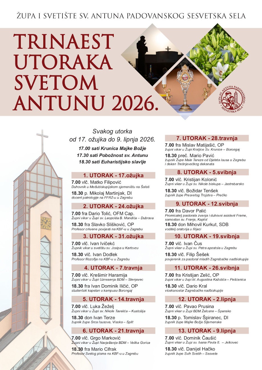 Pobožnost „13 utoraka sv. Antunu” u Župi i svetištu sv. Antuna Padovanskog u Sesvetskim selima počet će u utorak, 17. ožujka. Prvi utorak misno slavlje u 7 predvodit će duhovnik u Međubiskupijskom sjemeništu na Šalati vlč. Matko Filipović, a u 18.30 docent patrologije na Fakultetu filozofije i religijskih znanosti u Zagrebu o. Mikolaj Martinjak.