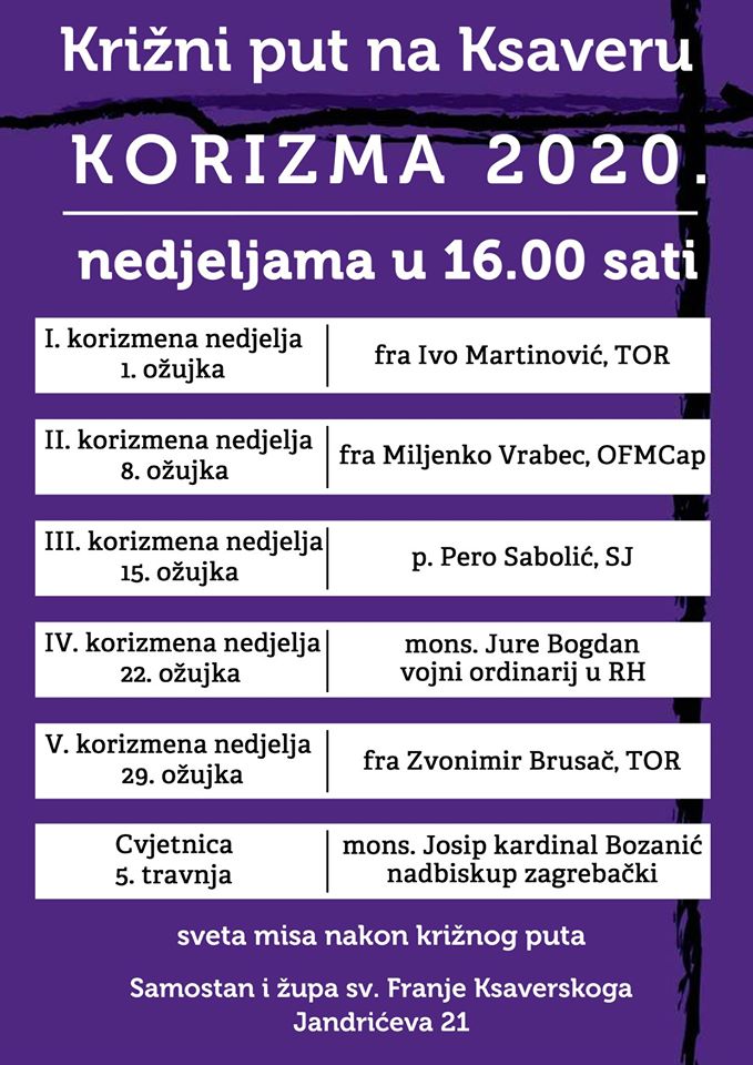 Zagreb, (IKA) – Pobožnost križnoga puta na Ksaveru održava se u korizmi nedjeljama u 16 sati. Nakon križnoga puta slavi se misa.