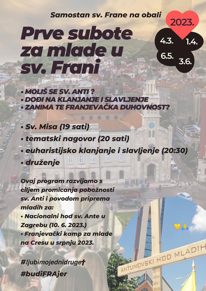 U crvki sv. Frane na Obali u Splitu u subotu 4. ožujka 2023. počinje ciklus susreta mladih koji će se održavati prve subote u mjesecu. Susreti su priprava za proslavu svetkovine sv. Antuna Padovanskoga i nacionalni Antunovski hod mladih.