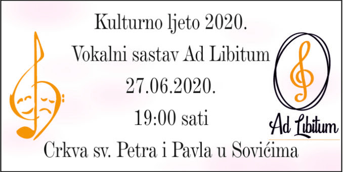 U organizaciji Bratovštine sv. Stjepana Prvomučenika Gorica-Sovići, u filijalnoj crkvi sv. Petra i Pavla u Sovićima u drugoj večeri trodnevnice pred svetkovinu apostolskih prvaka, nakon mise koja počinje u 19 sati, održat će se koncert Vokalnog sastava Ad Libitum iz Novog Travnika. Tim koncertom otvorit će se Kulturno ljeto u Župi Gorica-Sovići.