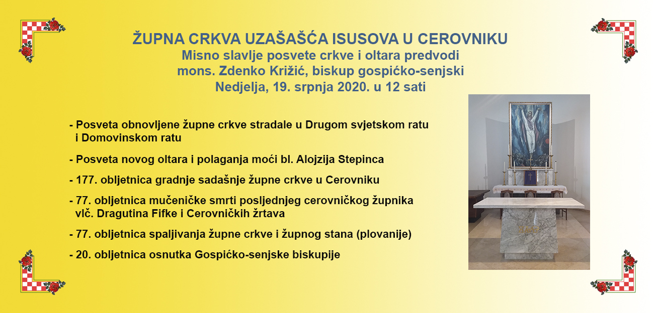 CEROVNIK (IKA) – Misno slavlje posvete novog oltara i obnovljene župne crkve Uzašašća Isusova u Cerovniku kraj Ogulina u nedjelju 19. srpnja predvodit će gospićko-senjski biskup mons. Zdenko Križić. Misa počinje u 12 sati. U prilogu je službeni plakat događanja.
