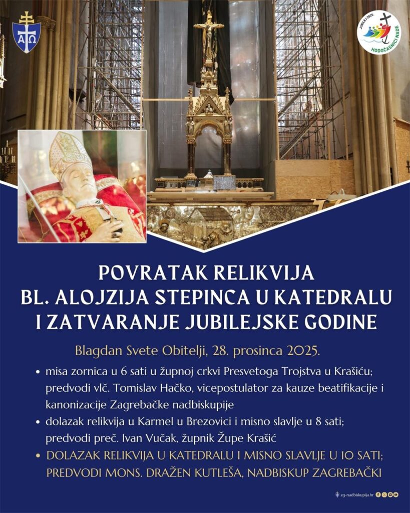 Tom prigodom svečano će se dočekati i povratak relikvija (tijela) bl. Alojzija Stepinca iz Krašića u Zagrebačku prvostolnicu. Relikvije će iz Krašića krenuti nakon mise zornice u 6 sati koju će predvoditi vlč. Tomislav Hačko, vicepostulator za kauze beatifikacije i kanonizacije Zagrebačke nadbiskupije. Na putu prema Zagrebu relikvije će se zaustaviti u Karmelu u Brezovici, gdje će misno slavlje u 8 sati predvoditi preč. Ivan Vučak, župnik Župe Presvetoga Trojstva u Krašiću.