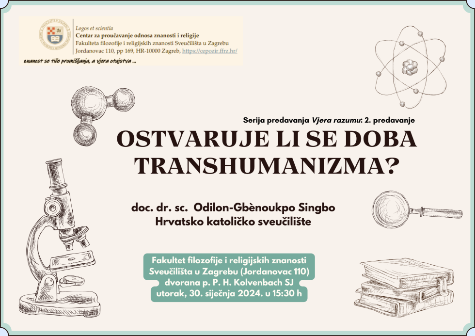 Zagreb, (IKA) – Dr. vlč. Odilon-Gbènoukpo Singbo održat će predavanje „Ostvaruje li se doba transhumanizma?“ u utorak 30. siječnja u 15.30 u dvorani o. P. H. Kolvenbacha, SJ na Fakultetu filozofije i religijskih znanosti Sveučilišta u Zagrebu (Jordanovac 110).