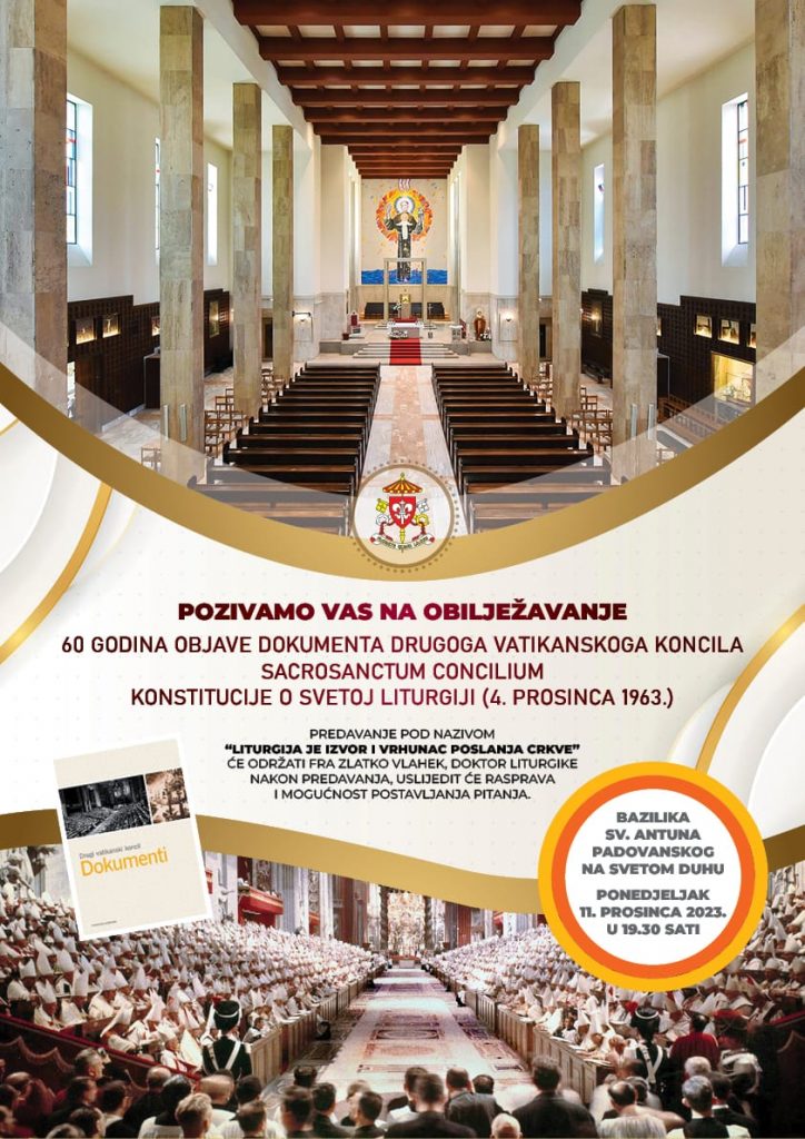 Predavanje „Liturgija je izvor i vrhunac poslanja Crkve“, u povodu 60. obljetnice proglašenja Konstitucije o svetoj liturgiji Sacrosanctum concilium, održat će u ponedjeljak, 11. prosinca 2023. doktor liturgike fra Zlatko Vlahek, OFMConv, u bazilici sv. Antuna Padovanskog u Zagrebu. Predavanje će početi u 19:30.