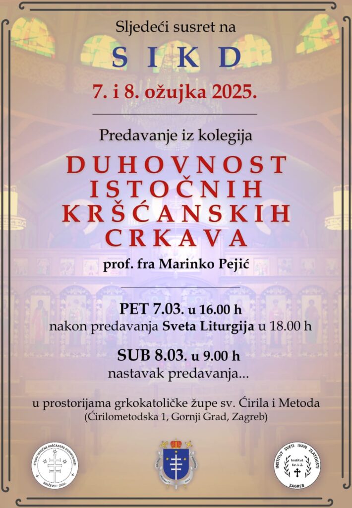 Prof. fra Marinko Pejić održat će predavanje „Duhovnost istočnih kršćanskih Crkava“ u petak 7. ožujka u 16 sati i subotu 8. ožujka u 9 sati u Grkokatoličkom sjemeništu u Zagrebu, Ćirilometodska 1. Predavanje je namijenjeno polaznicima Studija istočne kršćanske duhovnosti, ali je otvoreno i za sve ostale zainteresirane.