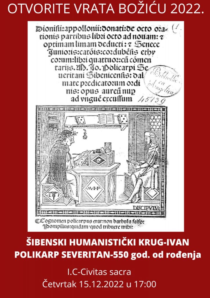 Šibenik, (IKA) – U sklopu manifestacije „Otvorite vrata Božiću 2022.“ u četvrtak 15. prosinca u 17 sati u Interpretacijskom centru katedrale Sv. Jakova „Civitas sacra“ bit će održano predavanje „Šibenski humanistički krug – Ivan Polikarp Severitan – 550 godina od rođenja“.