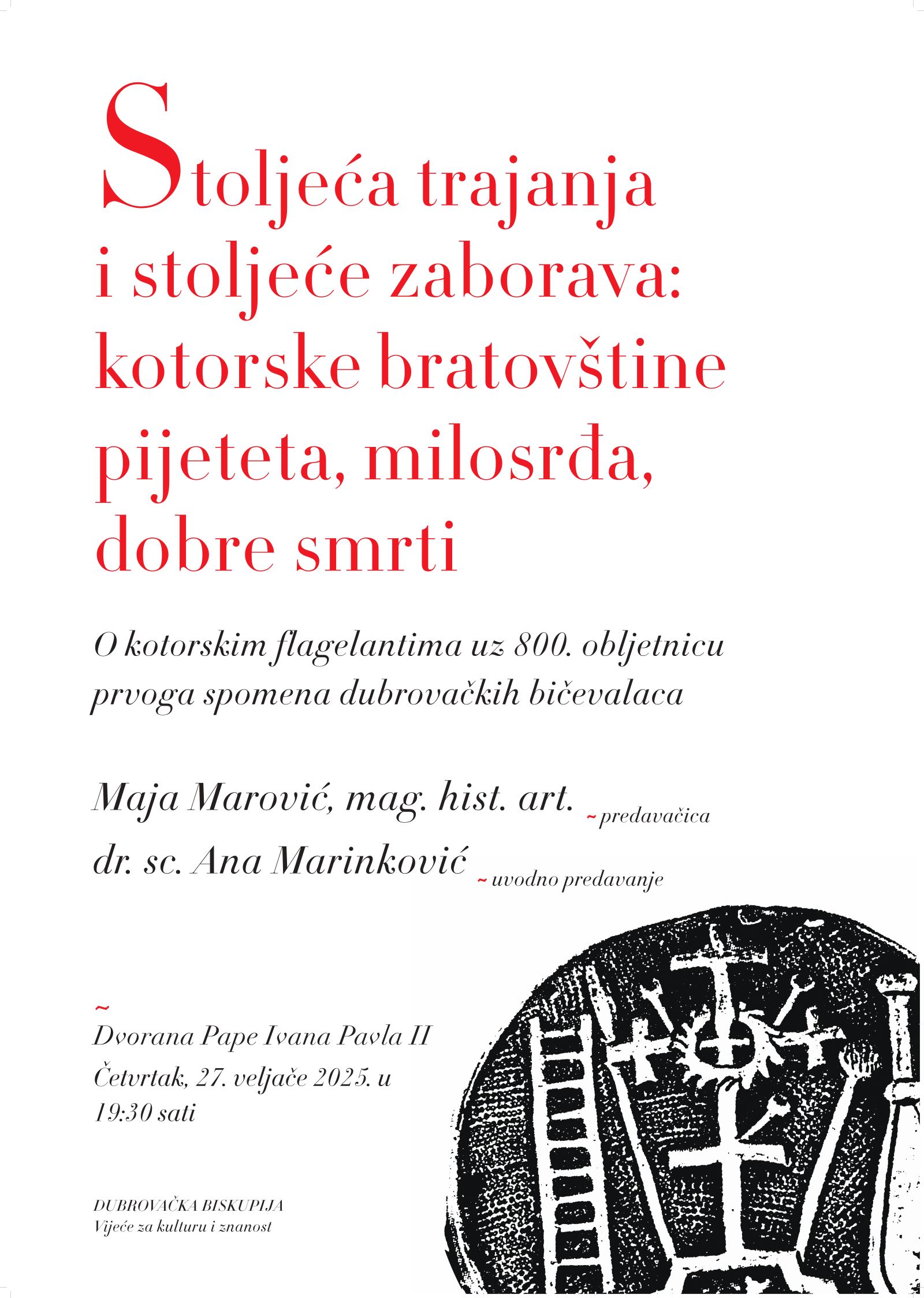 Vijeće za kulturu i znanost Dubrovačke biskupije u svome redovitom programu organizira predavanje „Stoljeća trajanja i stoljeće zaborava: kotorske bratovštine pijeteta, milosrđa, dobre smrti: O kotorskim flagelantima uz 800. obljetnicu prvoga spomena dubrovačkih bičevalaca“ koje će u četvrtak 27. veljače u 19.30 sati u dvorani pape Ivana Pavla II. u Dubrovniku održati Maja Marović uz uvodno izlaganje Ane Marinković.