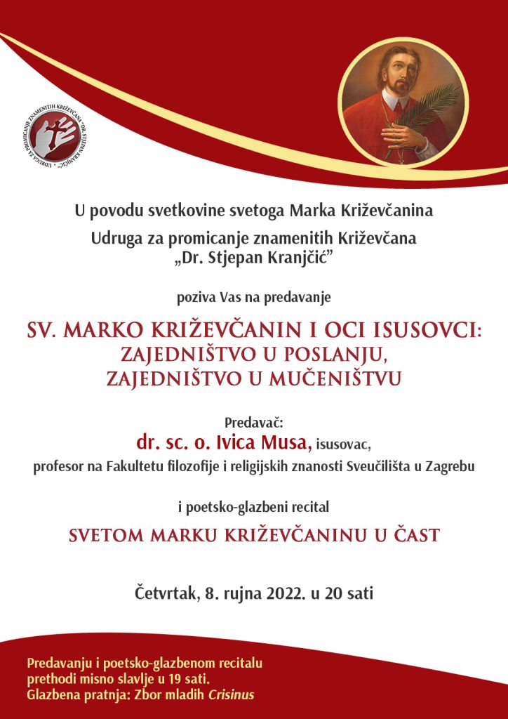 „Sveti Marko Križevčanin i oci isusovci: zajedništvo u poslanju, zajedništvo u mučeništvu“ – tema je predavanja koje će u okviru danâ sv. Marka Križevčanina u križevačkoj župnoj crkvi sv. Ane, na blagdan Male Gospe, u četvrtak 8. rujna 2022., održati isusovac dr. sc. o. Ivica Musa, profesor na Fakultetu filozofije i religijskih znanosti Sveučilišta u Zagrebu.