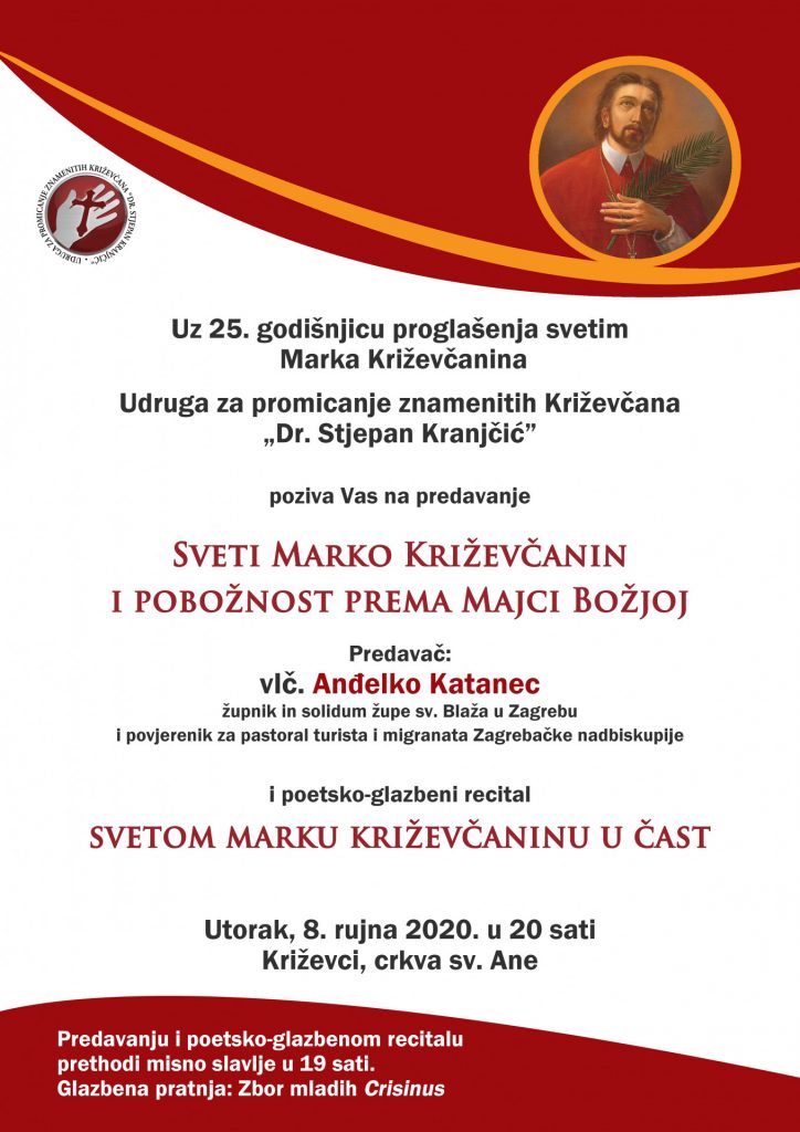 Predavanje će u sklopu dvotjednih dana sv. Marka Križevčanina, u križevačkoj župnoj crkvi sv. Ane, na blagdan Male Gospe 8. rujna 2020., održati vlč. Anđelko Katanec, župnik in solidum Župe sv. Blaža u Zagrebu i povjerenik za pastoral turista i migranata Zagrebačke nadbiskupije.