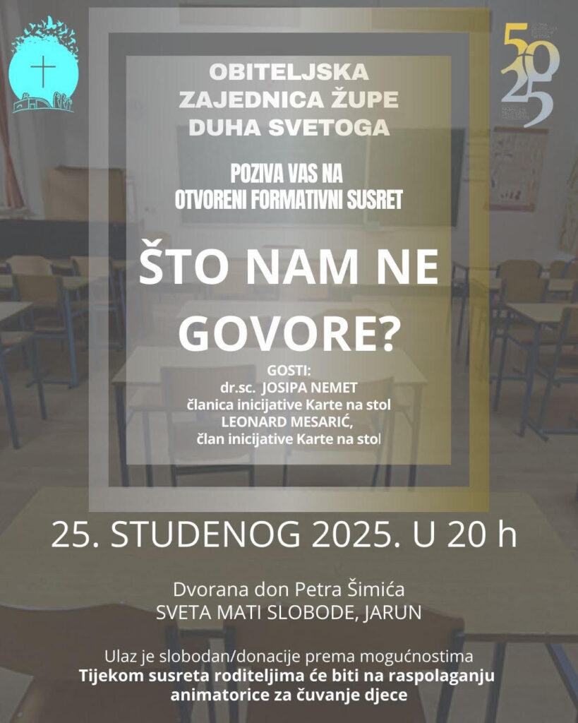Obiteljska zajednica župe Duha Svetoga organizira u utorak, 25. studenoga, u 20 sati u Dvorani don Petra Šimića otvoreni formativni susret u sklopu ovogodišnjeg ciklusa Aktualnosti.