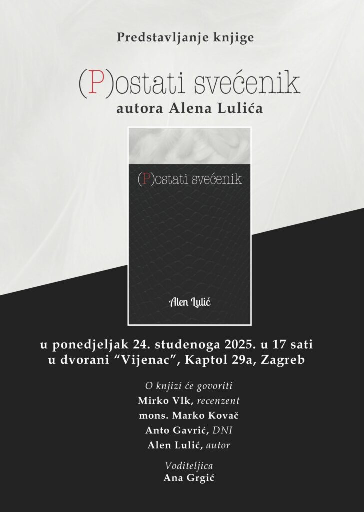 Predstavljanje knjige „(P)ostati svećenik“, autora crkvenog pravnika i upravitelja Župe Uzašašća Gospodnjega u novozagrebačkom naselju Sloboština dr. Alena Lulića, održat će se u ponedjeljak 24. studenoga u 17 sati u dvorani „Vijenac“ Nadbiskupijskoga pastoralnog instituta na Kaptolu 29a u Zagrebu.