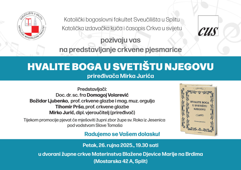 Pjesmarica „Hvalite Boga u svetištu njegovu“, priređivača Mirka Jurića, bit će predstavljena u petak 26. rujna u 19.30 u dvorani župne crkve Materinstva BDM na Brdima u Splitu.