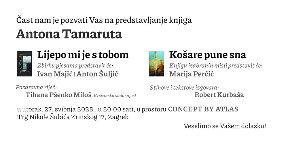 U utorak, 27. svibnja u 20 sati u prostoru Concept by atlas u Zagrebu održat će se predstavljanje knjiga Antona Tamaruta “Lijepo mi je s tobom” i “Košare pune sna”.
