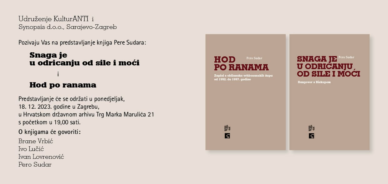 Predstavljanje knjiga mons. Pere Sudara “Snaga je u odricanu od sile i moći. Razgovor s biskupom” i “Hod po ranama. Zapisi o obilasku vrhbosanskih župa od 1992. do 1997. godine” održat će se u ponedjeljak, 18. prosinca u Hrvatskom državnom arhivu u Zagrebu s početkom u 19 sati.