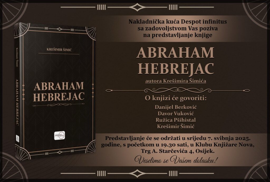 Predstavljanje knjige „Abraham Hebrejac“ dr. sc. Krešimira Šimića u izdanju izdavačke kuće Despot infinitus održat će se u srijedu, 7. svibnja u 19:30 u Klubu Knjižare Nova (Trg A. Starčevića 4) u Osijeku.